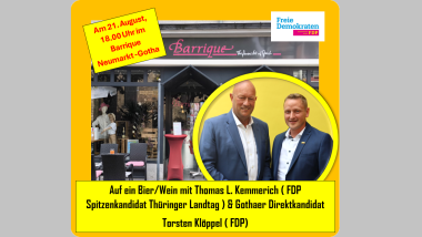 14.08.2024 Auf ein Bier mit Kemmerich in Gotha Am 21.August mit unseren Landtagskandidaten ins Gespräch kommen. Mehr dazu